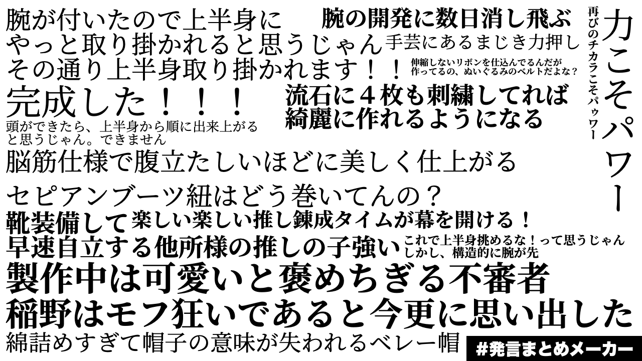 先日のイベントで『自分のぬいぐるみの技量が足りてないのでは』と不安になった稲野。他所様の子作りますと募集して、フォロワーさんから推しの子借りてアストルティアから現世に召喚した。